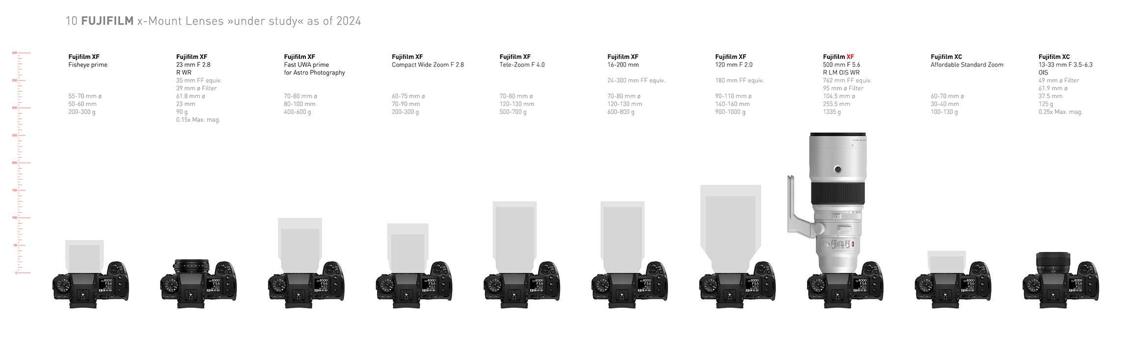 Fellow FR-reader Hiergeist (the guy who create an ultra-accurate render of the XF500mmF5.6 ahead of its announcement) created a chart showing all those lenses side by side, each represented in grey and mounted on an X-T5. The lens shapes are based on Fujifilm’s official spec estimates.