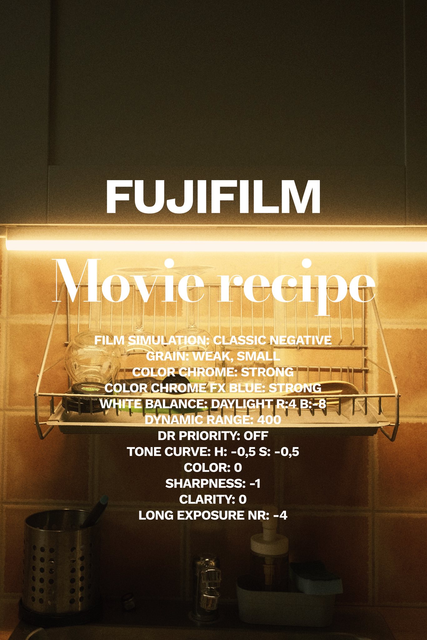This one was shared in our large Fujifilm Film Simulation group by Michal here, who aptly named it “Movie Recipe.”