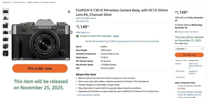 Amazon is now taking preorders for the Fujifilm X-T30 III and the XC13-33mmF3.5-6.3. Since they went live a bit later than the other stores, there’s a good chance Amazon’s waiting list is still shorter right now.