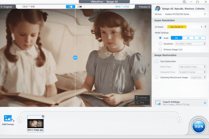 The Super Resolution models intelligently denoise, deblur, and restore details and texture gently, so surfaces and edges gain clarity without becoming harsh. You can upscale your shots by 2x, 3x, or 4x, or optimize details without changing the resolution using 1x enhancement. The software supports output resolutions up to 10K for images.